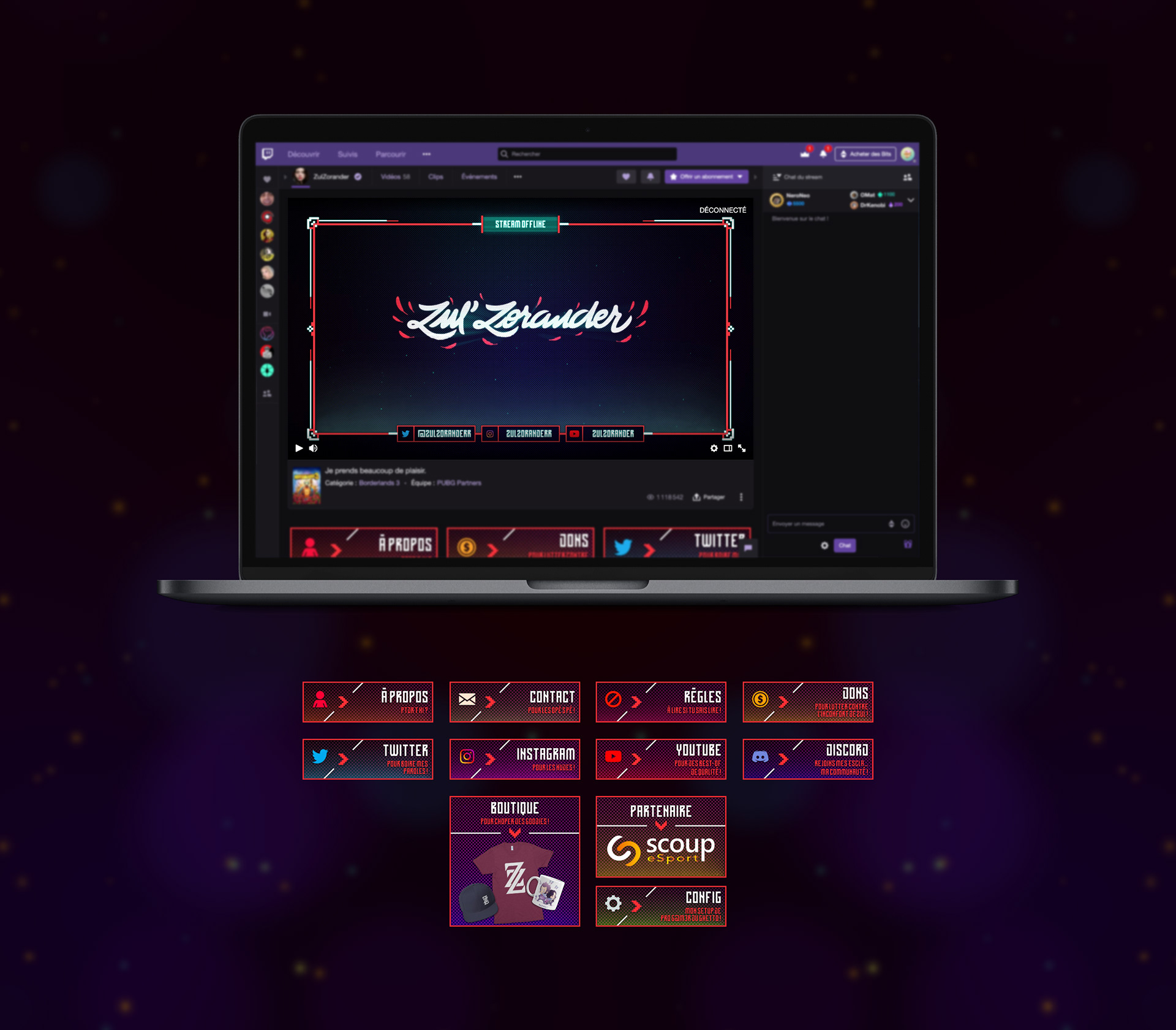 Création de l'identité visuelle de la chaîne twitch de Zul'Zorander, comprenant création d’un logo, conception de panneaux d’informations, et élaboration d’écrans animés d’introduction, de pause et de fin de live.